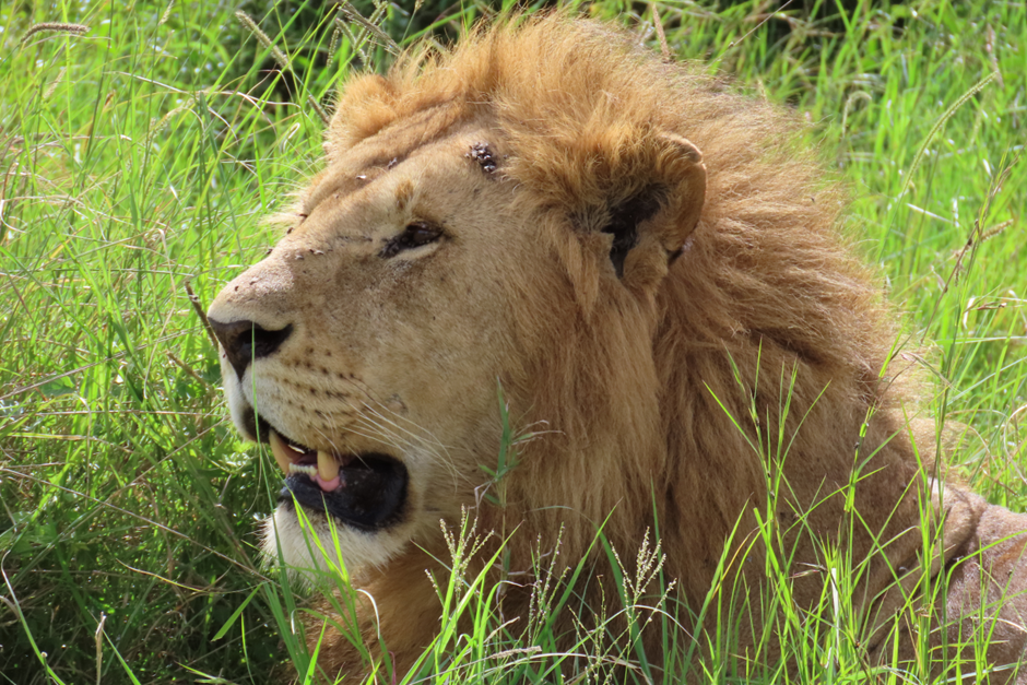 About a kilometre further on we were looking at a herd (or a parade, which I like more) of elephants also on our right when Simon stopped the jeep.  Lying on our left next to the road on a slight bank was a male lion.  Who took no notice of us at all.