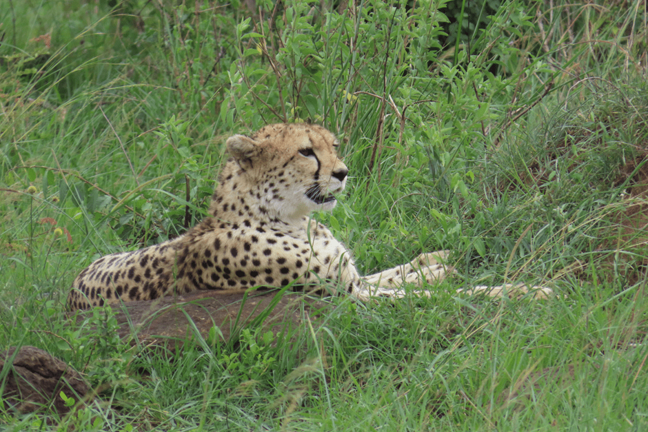 On our way off the plain, the two vehicles we could see in the distance suddenly careered off the road and went up a small rise where there was no track – woe betide them if a ranger showed up. Simon saw what they had seen and followed them.  And lo and behold, there was a cheetah, lying on a rock, looking perfectly at ease and seemingly not bothered by these three noisy vehicles that had driven up, the first two (safari tour businesses from outside the reserve) stopping way too close, in my humble opinion.