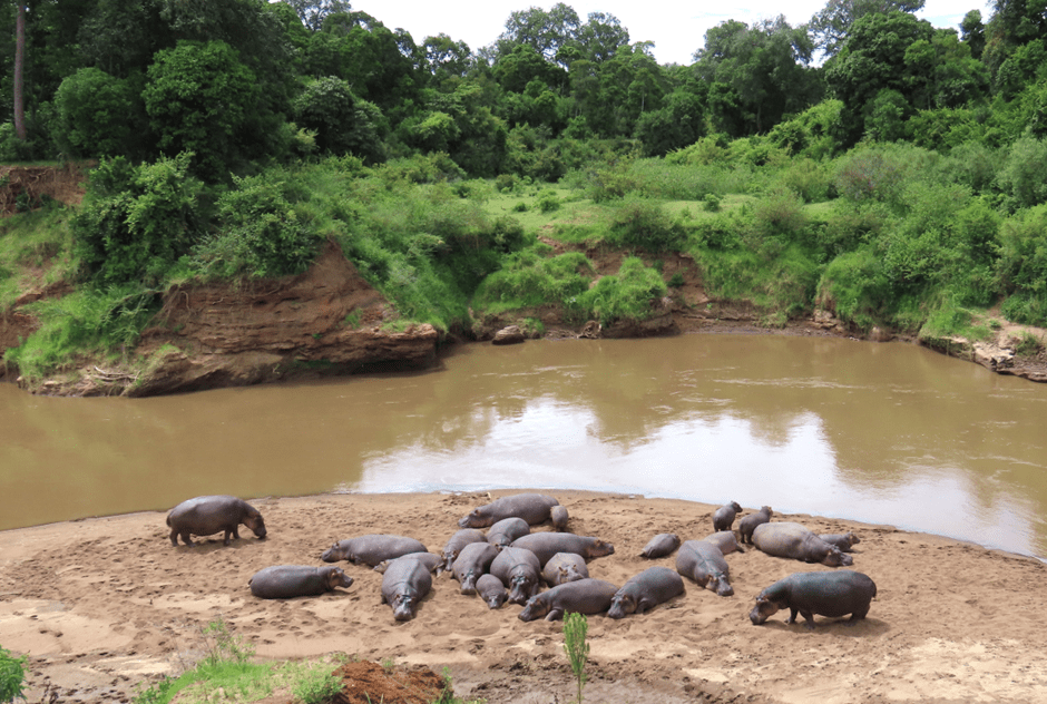 The other name for a group is a thunder, maybe because they make a very loud, deep, throaty bellow that can keep people like Sabine awake at night.  Especially when one of them is right outside your tent.  They’re nocturnal grazers, coming out of the water at night to eat.  A path they use from the river below our tent came out into the camp just by us.  Not a good idea to sleep walk.  This is a photo of the bloat below the camp, sunbathing on their beach before hopping back into the river to cool down again.