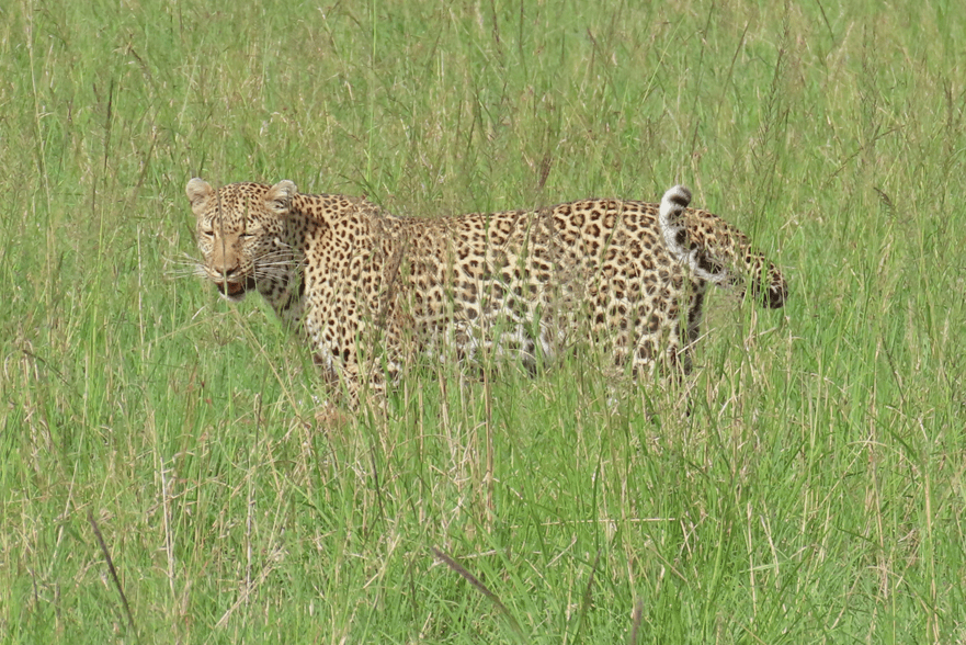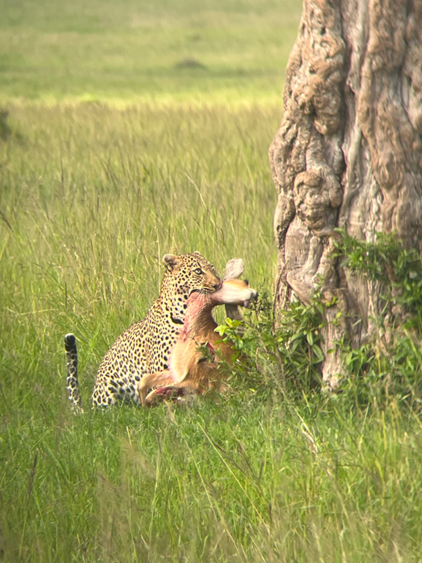 When we arrived the leopard was in some long grass off to our right.  Simon told us it had a kill.  He looked around and saw a tree off to our left and said we needed to be on the other side of the tree.  Some of the other guides had also worked that out too so we followed two or three safari jeeps along some tracks to where they all thought we’d get to see the leopard best.