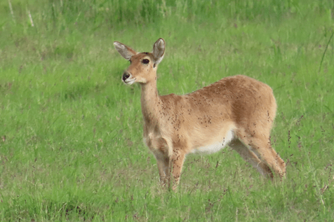 Back to the road trip, the drive from the Dik-dik to the camp lasted an hour or more.  We could begin to recognised the landscape as we got closer, particularly the airstrip where we had landed a few days before.  It reminded us that the first animal we saw after being collected by Simon two days before was a reedbuck.  This is a female; the males has horns.  Note the flies – on every animal, it seemed.