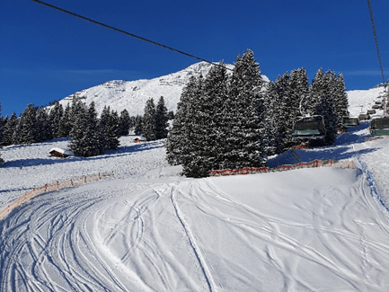 I have to address the ski conditions and I think this photo taken from the valley during an apres-ski afternoon walk mid-week tells it all, and I’m not referring to Sabine’s love of woolly animals: