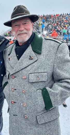 One of these lines, the Schladminger Loden (a really heavy felt coat, warm and water-proof), has been made even more famous by the celebrities who have purchased it.  It justifies a story in its own right, so I’ll simply attach a photo of Arnie sporting his Schladminger alongside one of Sabine modelling the Lodenwalker waistcoat, the latest addition to her wardrobe.